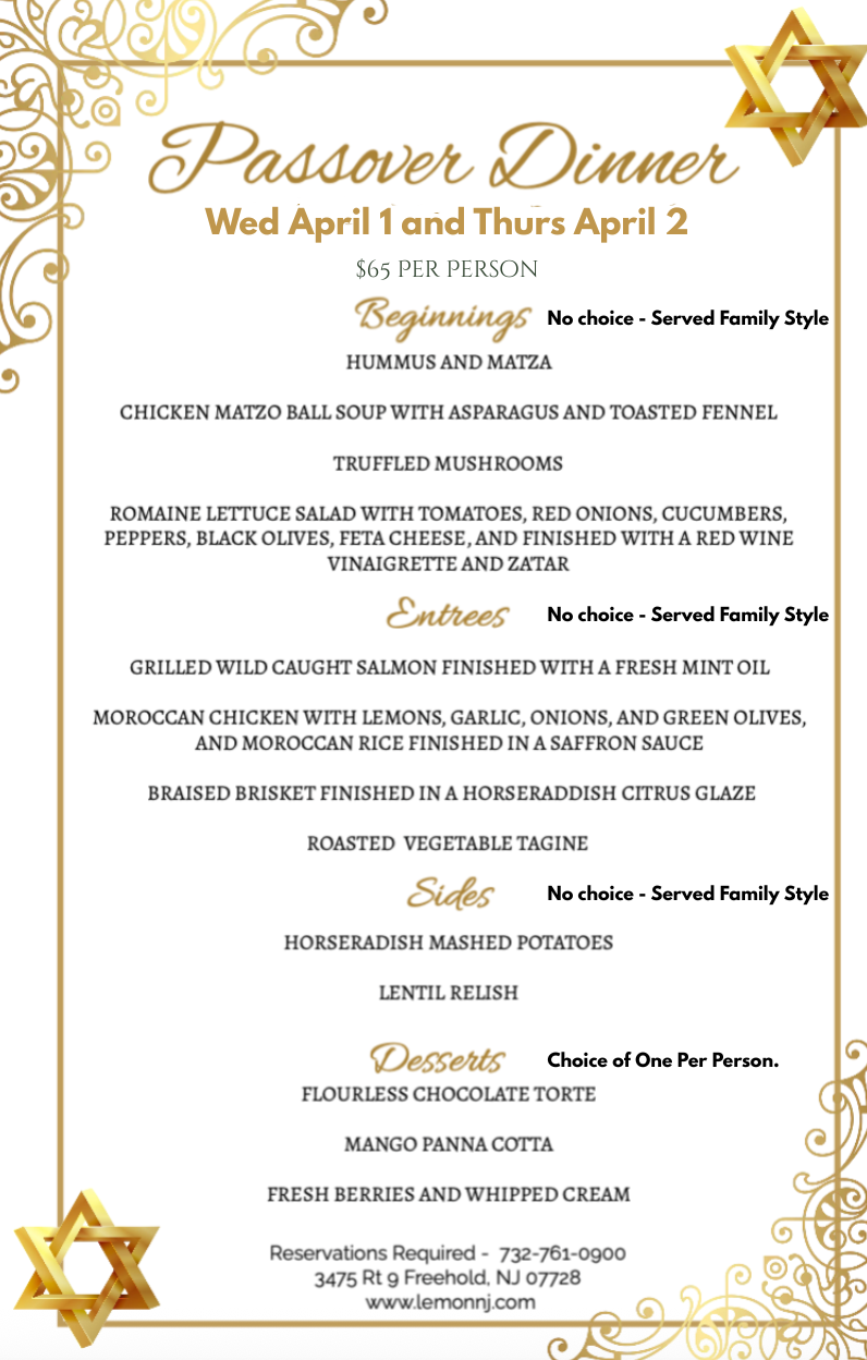 Join us at Lemon for a special Passover dinner on April 1st and 2nd. Enjoy a thoughtfully curated multi-course meal served family style—share hearty portions of savory starters, mains, and sides with your table—while dessert is individually plated. Priced at $65 per person, our menu blends Mediterranean and European influences to honor tradition with fresh, seasonal ingredients. Reservations required. .